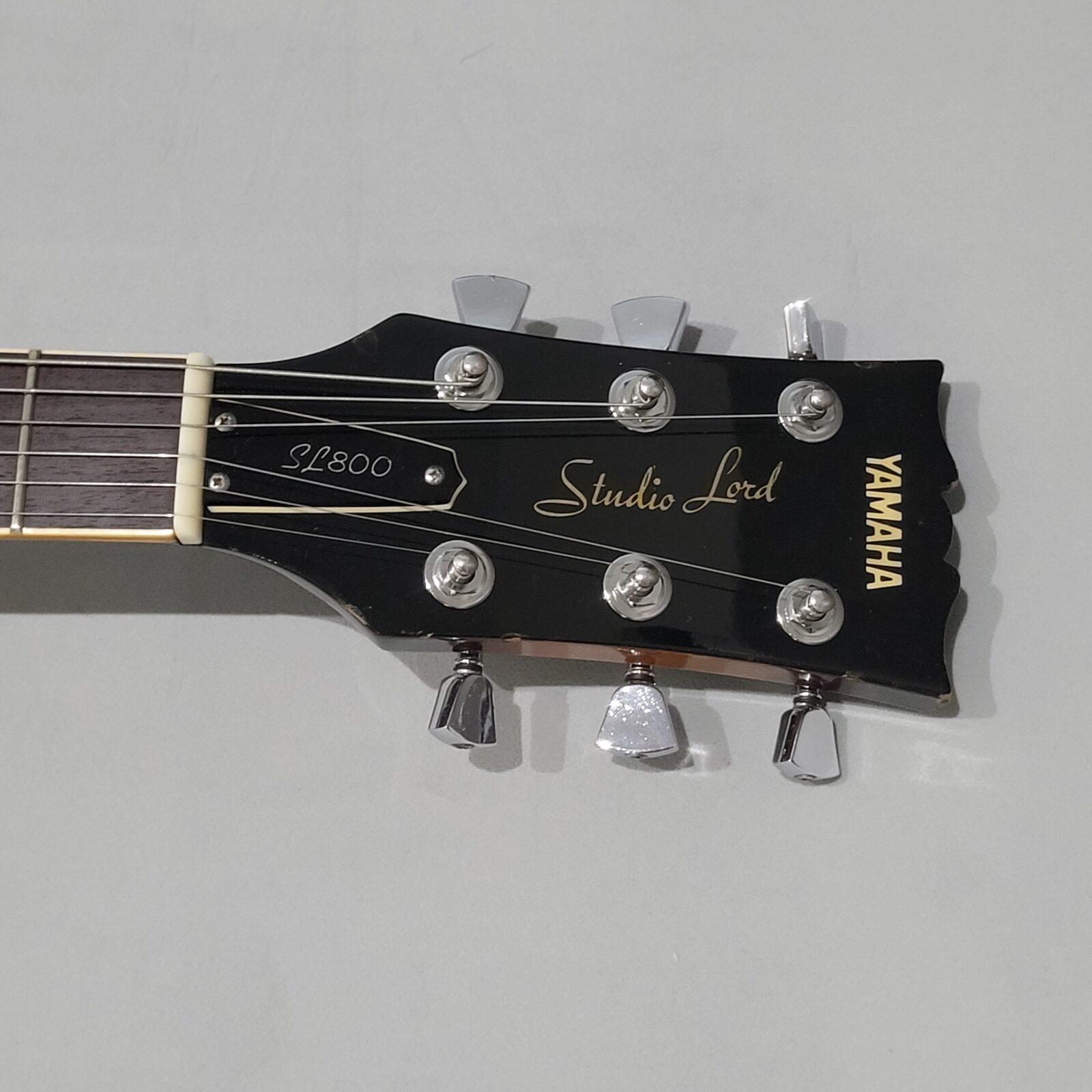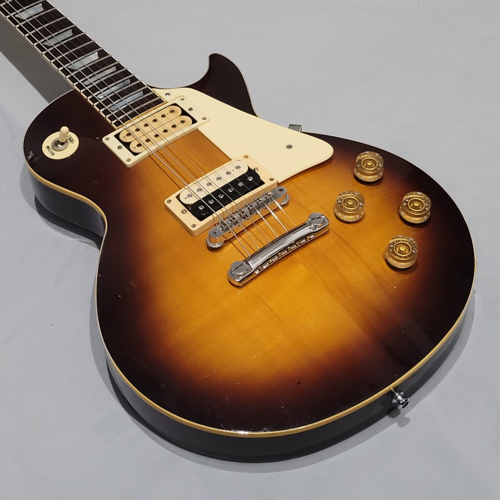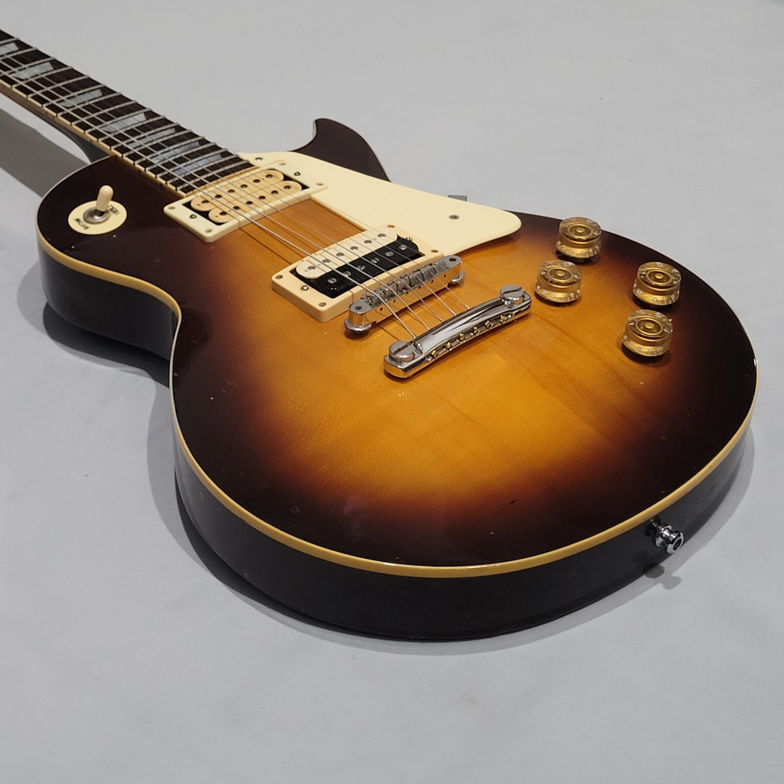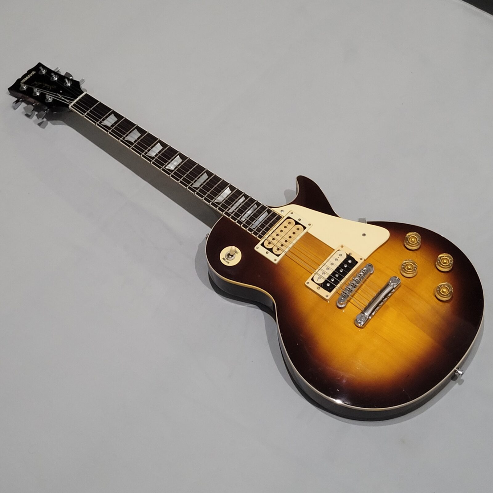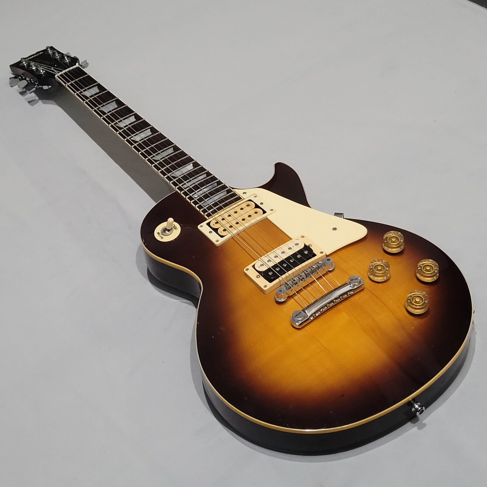Yamaha SL800 Studio Lord, czyli model ze wysokiej półki jeśli chodzi o les paule wytwarzane przez Yamahę w latach 80 w Japonii, często określany jako „high end” Yamahy w temacie LP. Korpus wykończony w ładnej przypalance, pickup pod gryfem wygląda na oryginalny, natomiast pod mostem siedzi seymour duncan ‘59, który brzmi raczej „wintydż” – jak ktoś lubi brzmienie Mike’a Nessa z Social Distortion to będzie w domu. Wiosło po pełnym serwisie, obejmującym m.in. wstawienie nowych progów i siodełka.