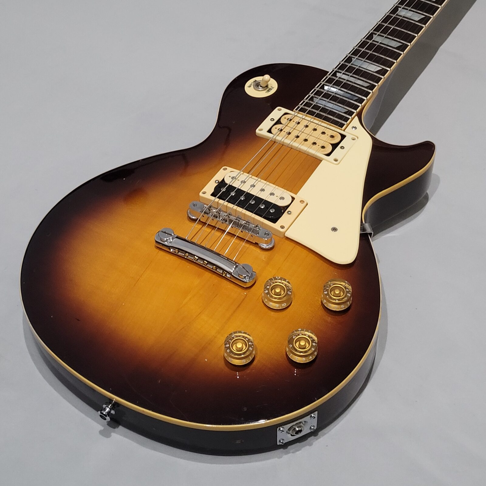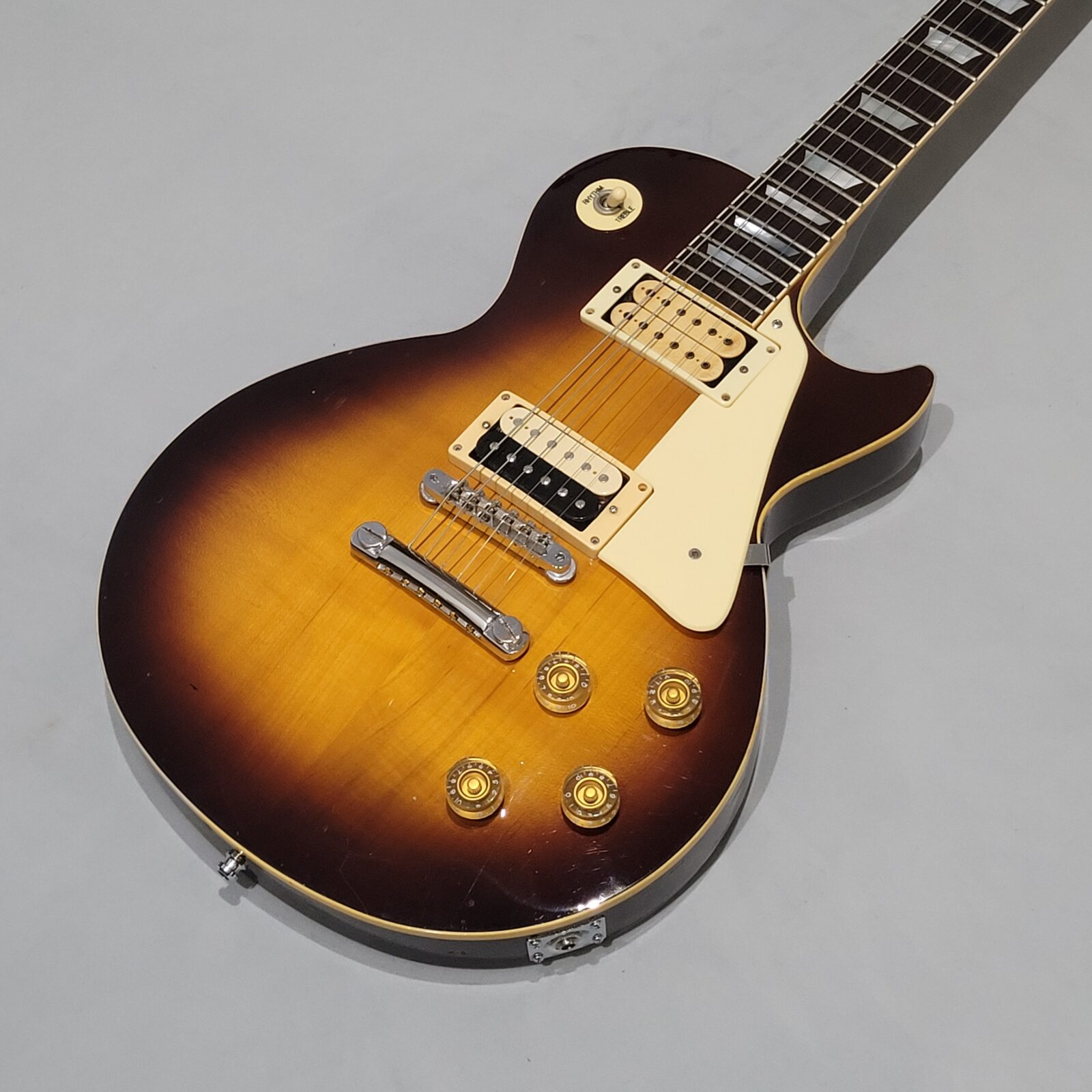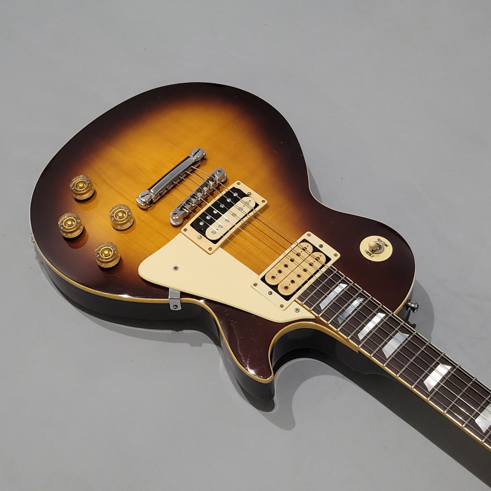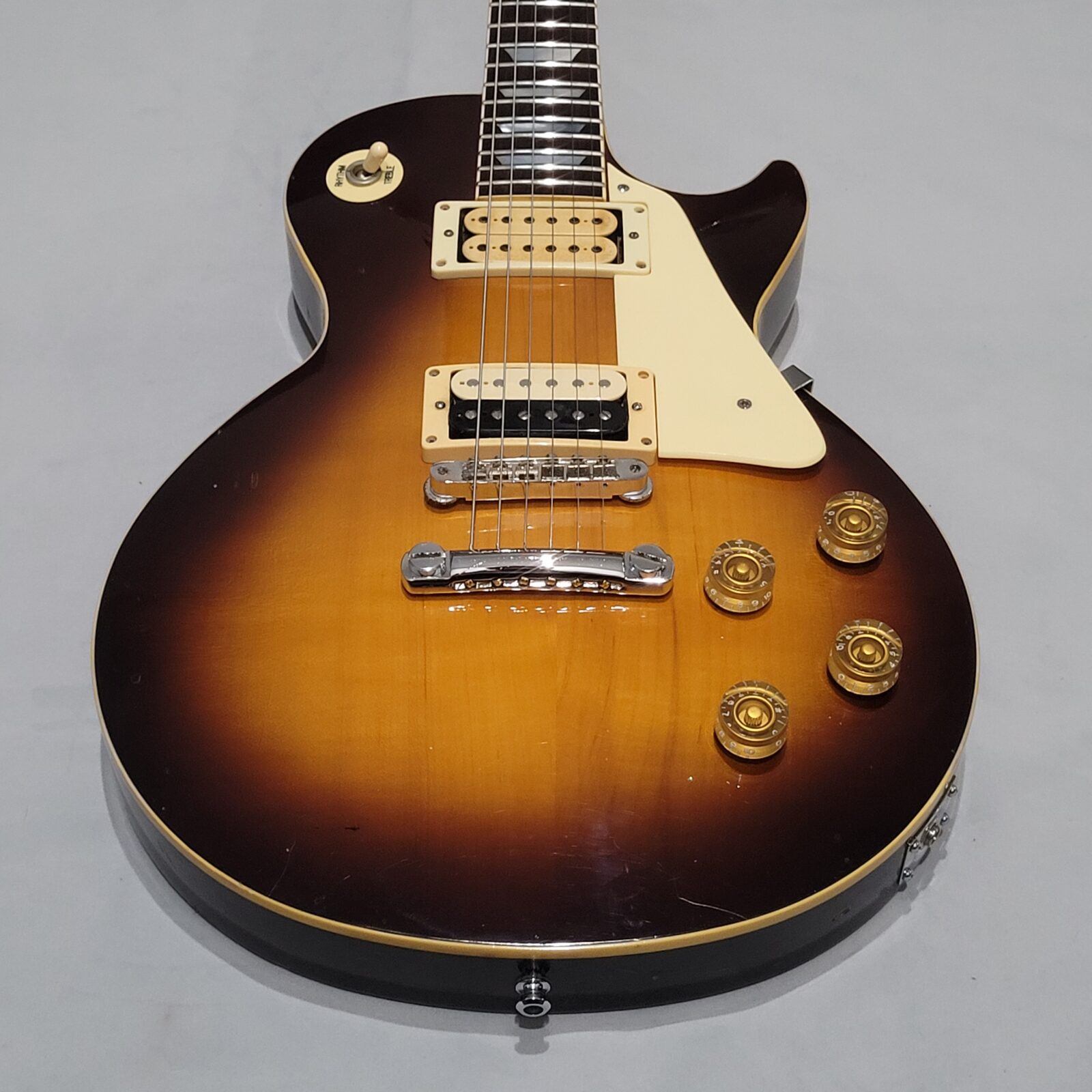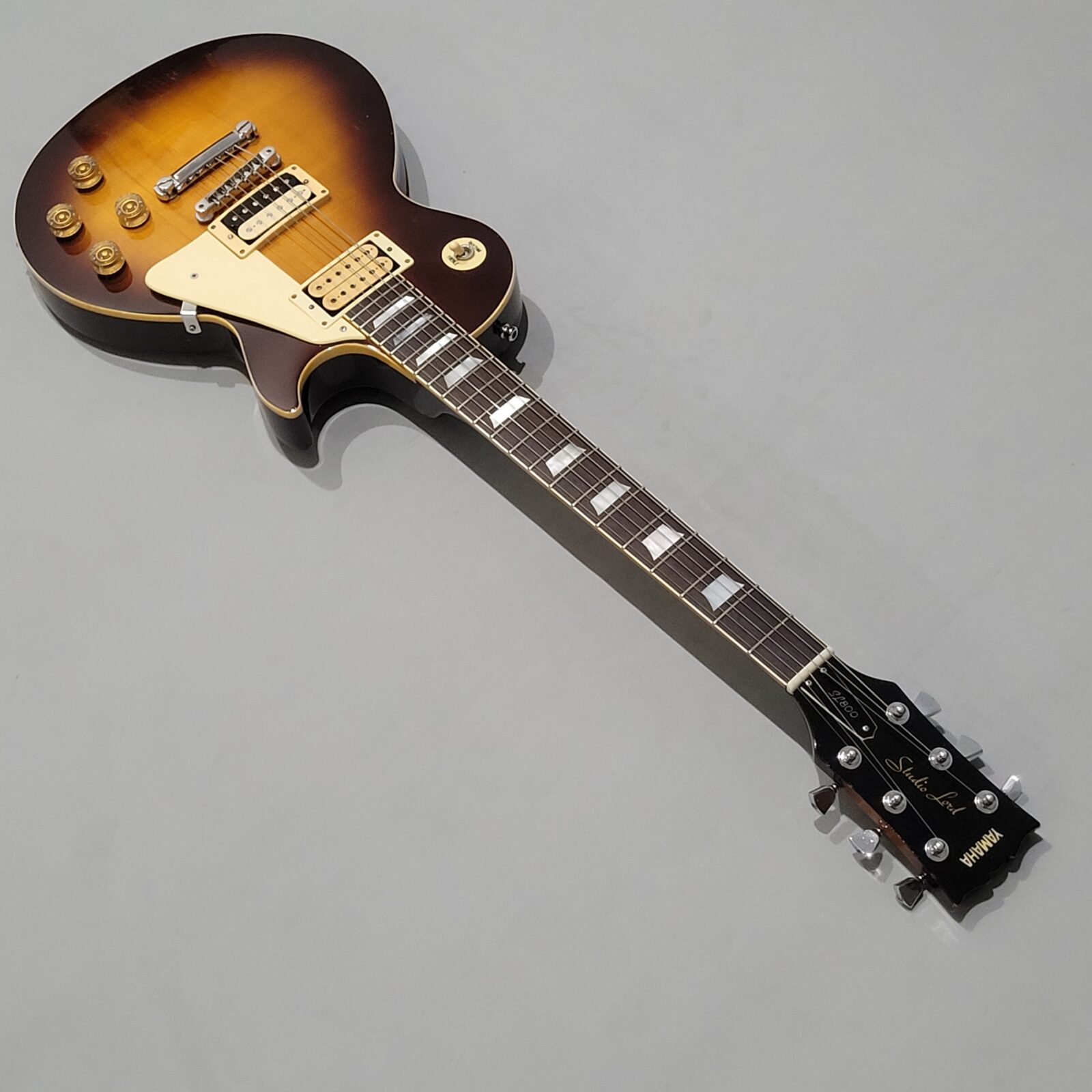 Yamaha SL800 Studio Lord, czyli model ze wysokiej półki jeśli chodzi o les paule wytwarzane przez Yamahę w latach 80 w Japonii, często określany jako „high end” Yamahy w temacie LP. Korpus wykończony w ładnej przypalance, pickup pod gryfem wygląda na oryginalny, natomiast pod mostem siedzi seymour duncan ‘59, który brzmi raczej „wintydż” – jak ktoś lubi brzmienie Mike’a Nessa z Social Distortion to będzie w domu. Wiosło po pełnym serwisie, obejmującym m.in. wstawienie nowych progów i siodełka.