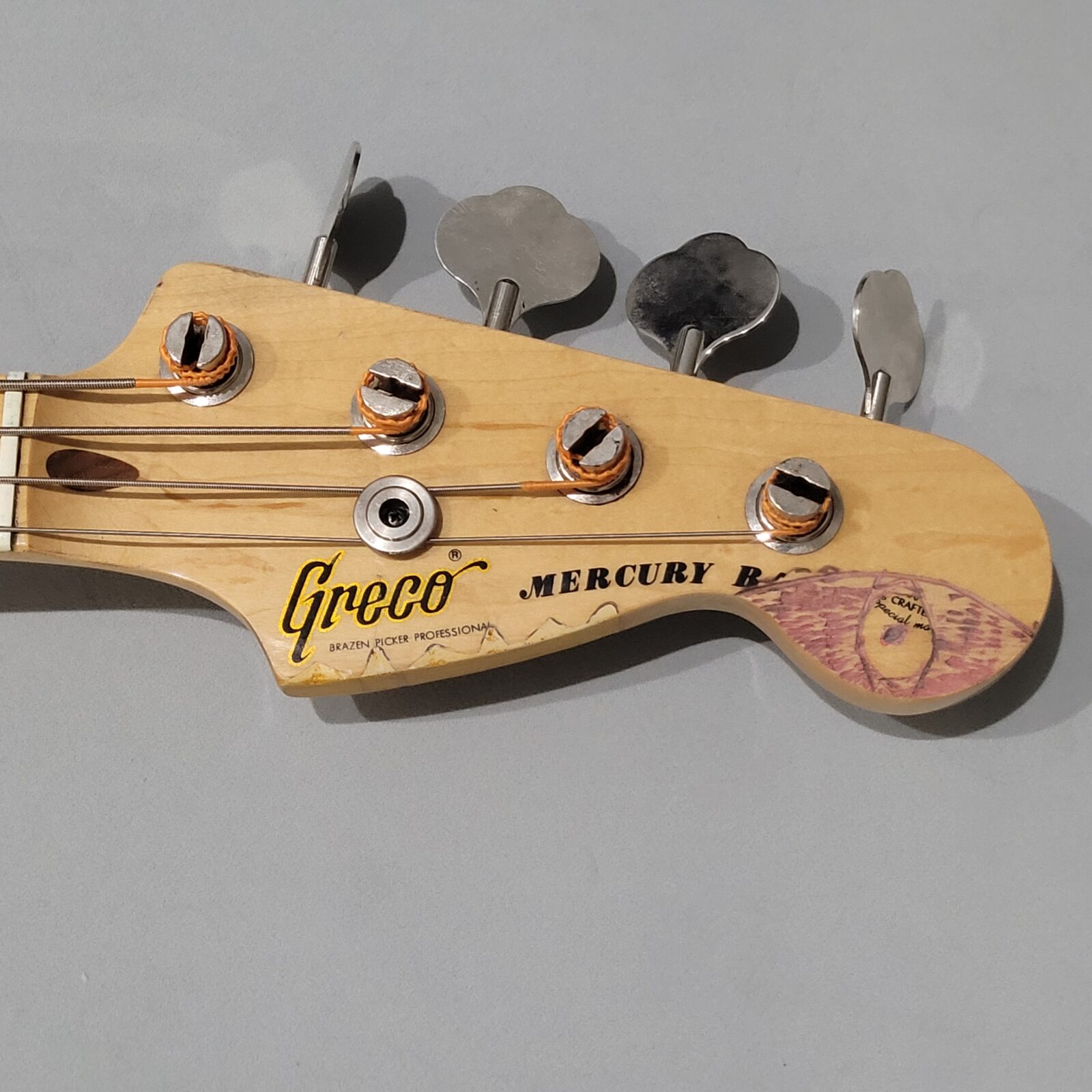 Pewne rzeczy się nie nudzą, tak jak precel w naturalu z klonowym gryfem, a do tego wyprodukowany w latach 70. Starannie wykonany w Japonii przez Greco, a do tego z serii Mercury Bass. Minusem gitary jest pozostawiona wizja artystyczna poprzedniego właściciela, widoczna na główce, w postaci płaskorzeźby, nie wiem co to jest, ocenę pozostawiam znawcom sztuki. Wyjdzie, że ja sztuki niedoceniam, ale truno będę z tym jakoś musiał żyć – stąd cena poniżej 3 kafli. Akcja strun ustawiona na uczciwe 2.00mm dla E/1,75mm dla G. Basen na elektronikę wyekranowany miedzią, precel miał zrobiony kompletny manicure i pedicure. Takie SPA tylko w Gitarach Orientu!