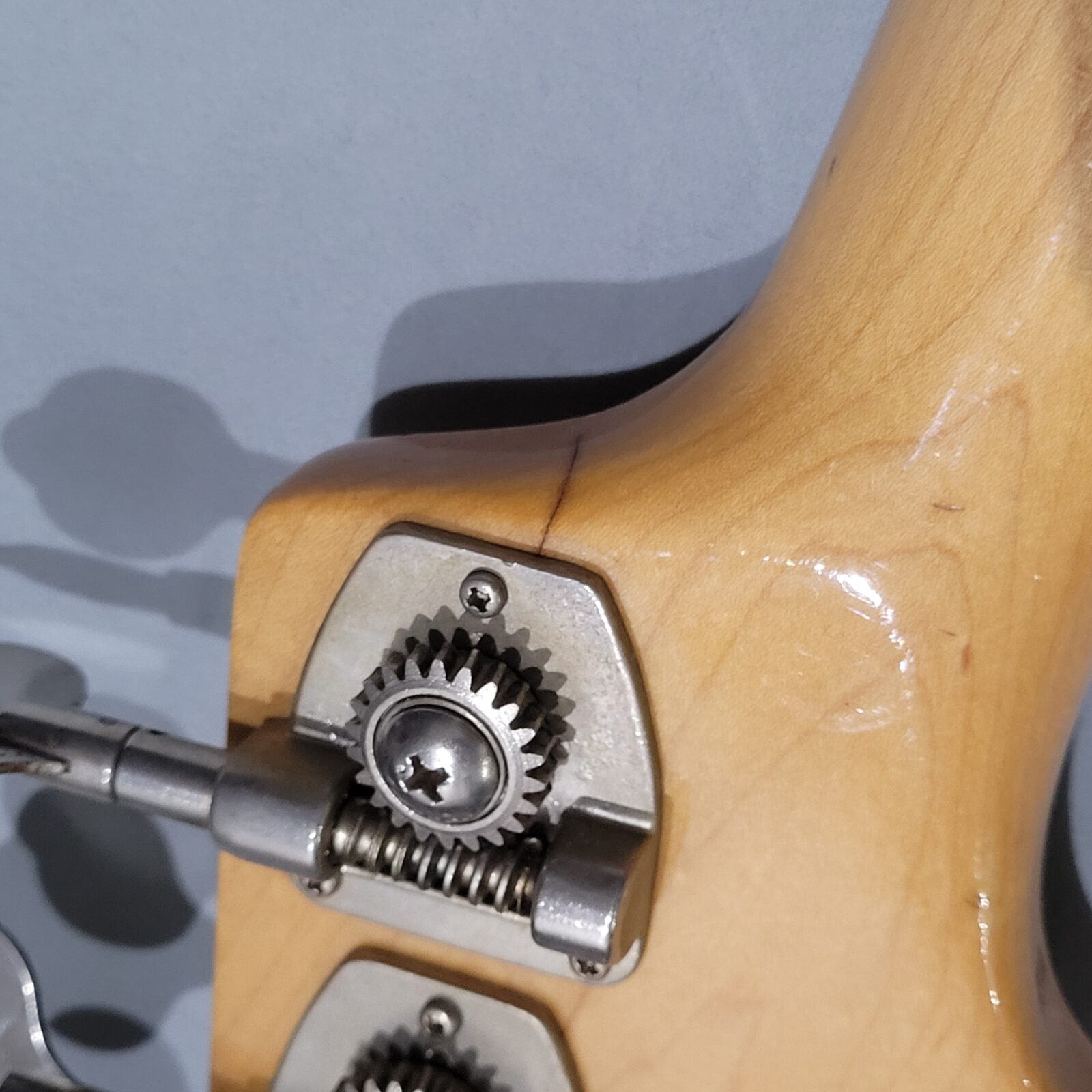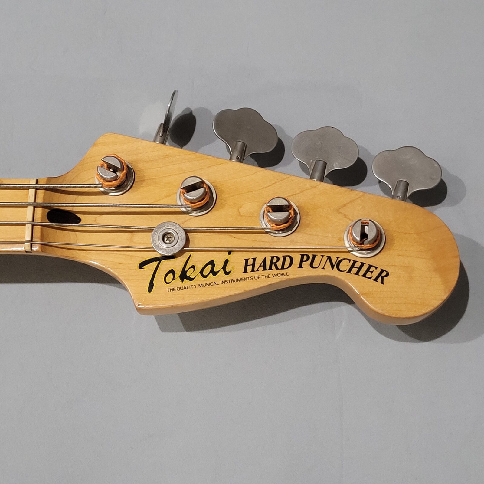 Tokai Hard Puncher w wersji PB48-YS (Yellow Sunburst) – ciekawostką jest, że w Tokaju kolor yellow sunburst miał swój osobny model, który był nieco droższy od podstawowych modeli „jednokolorowych”. Poza tym to typowy Tokai z lat 80, czyli korpus z sen, gryf klonowy z kategorii masywniejszych, osprzęt oryginalny. Gitara po serwisie, gotowa do gry. Przy kluczu struny E pęknięcie, widać jakiś stary temat, w niektórych Tokaiach tak się dzieje, nie idzie to dalej, nie wpływa na grę.