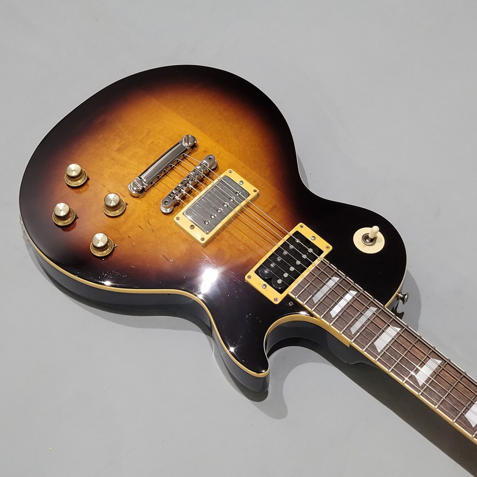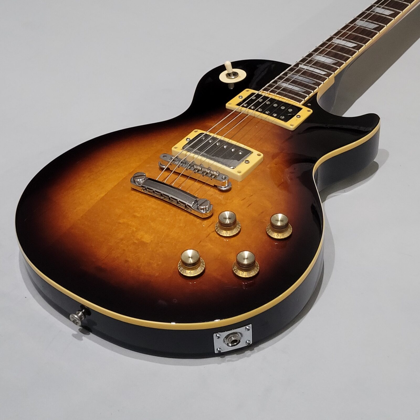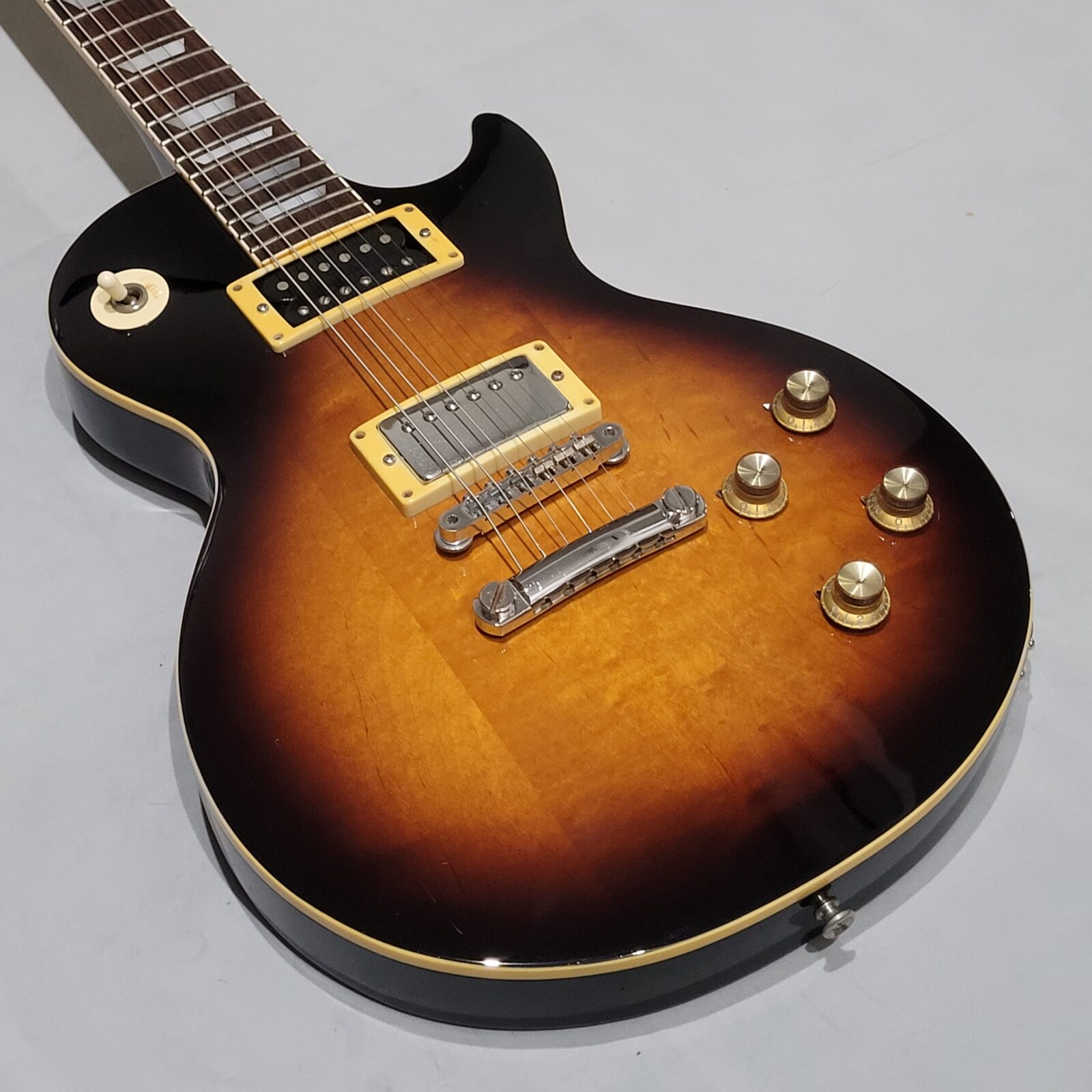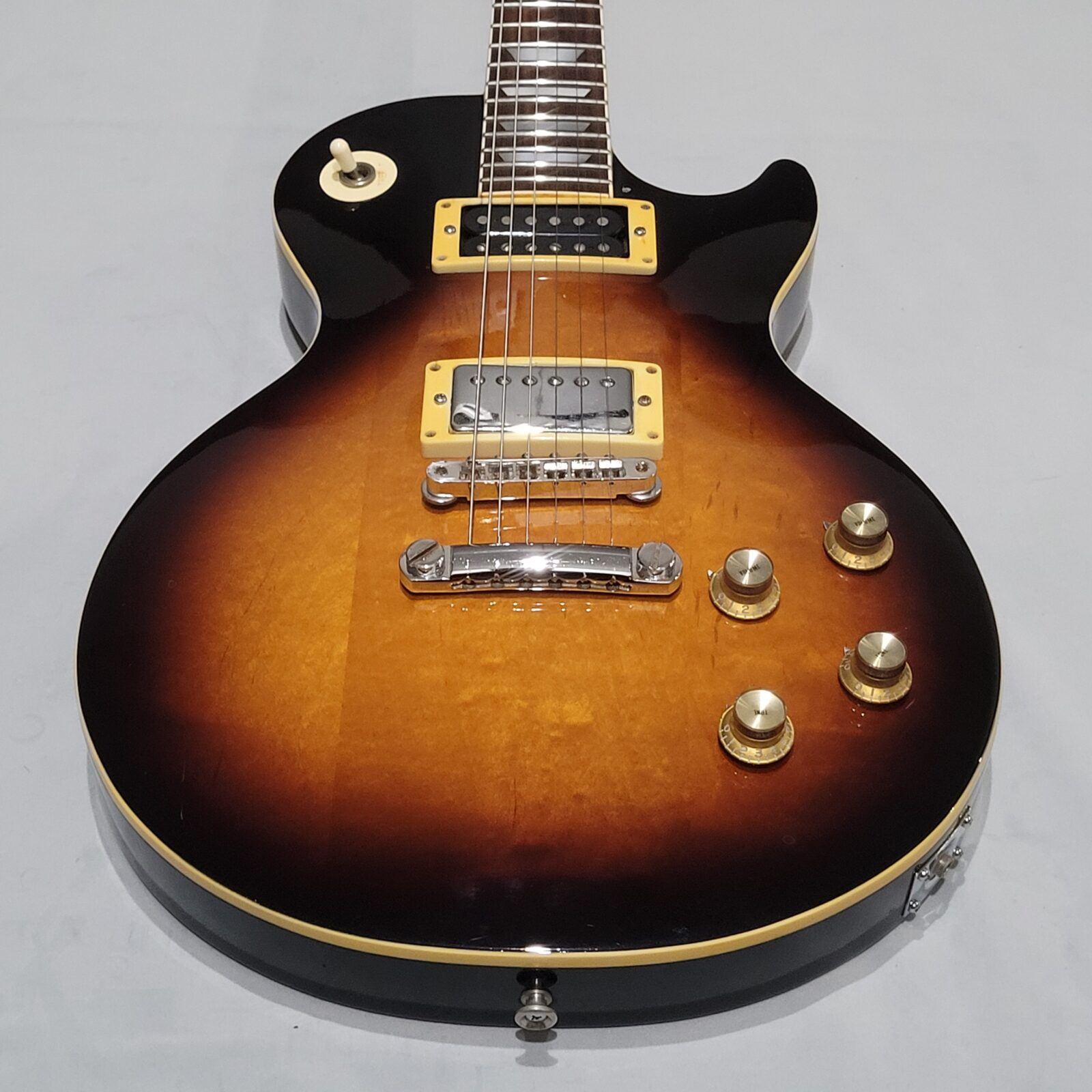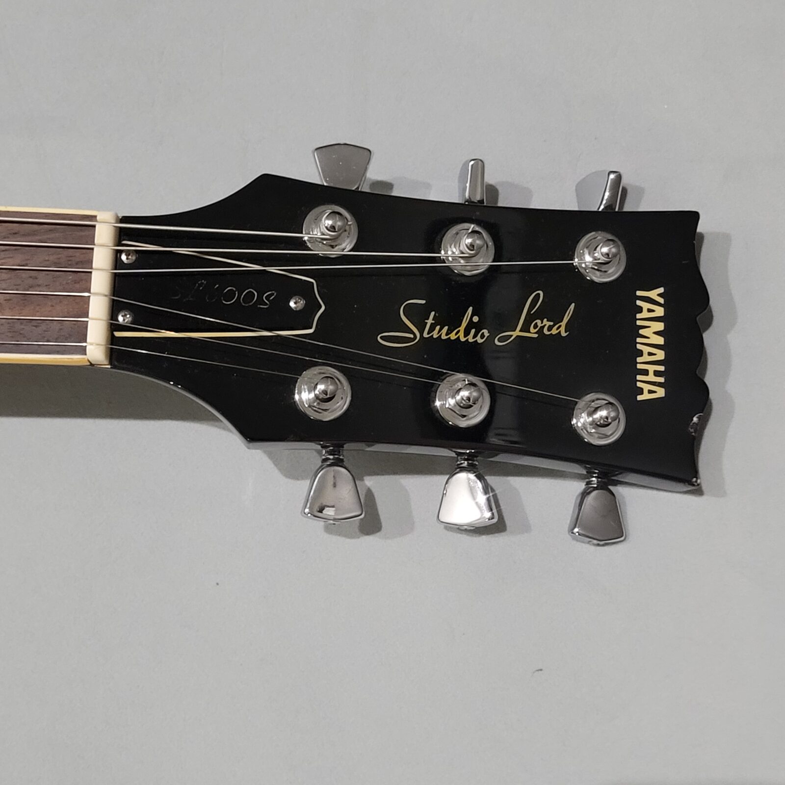 Yamaha SL600S Studio Lord, czyli model ze „średniej” półki jeśli chodzi o les paule wytwarzane przez Yamahę w latach 80 w Japonii. Tym razem w ładnej, tytoniowej przypalance, jeden pickup jest oryginalny, a drugi wymieniony – trudno mi powiedzieć co to jest, na pewno jest stary. Wiosło po pełnym serwisie, obejmującym wstawienie nowych progów.